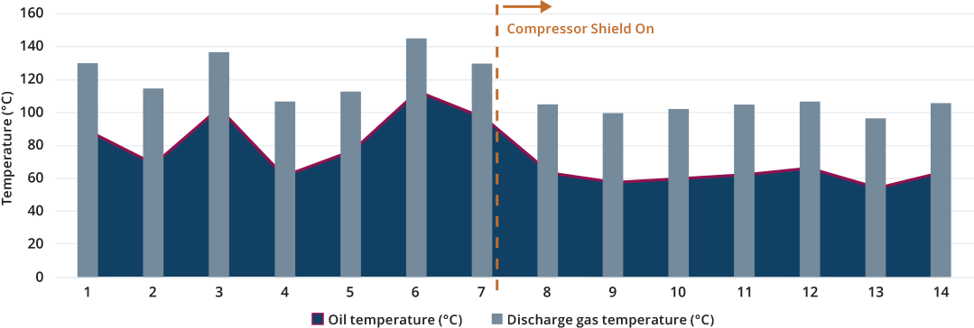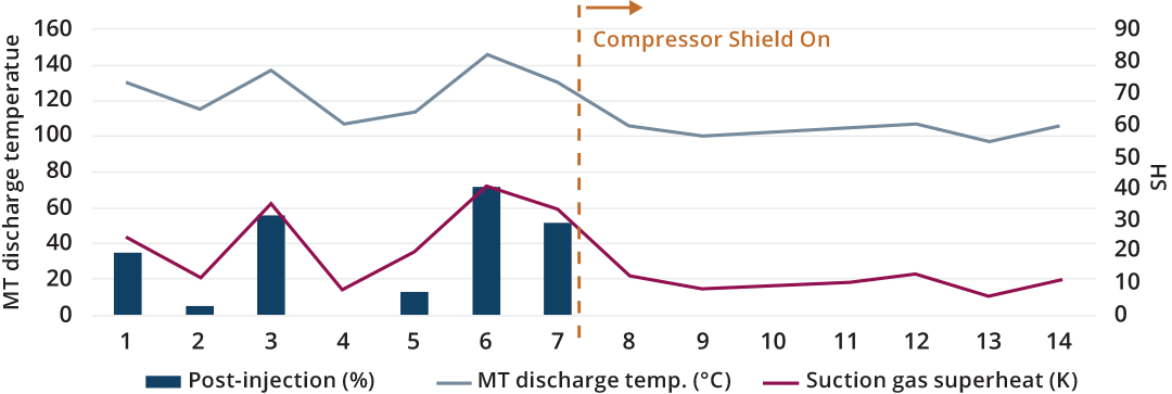 Vitalis Compressor Shield technology optimizes the suction temperature of the medium-stage compressors in transcritical CO2 booster systems. Furthermore, by controlling the oil temperature, we achieve improved lubrication and an extended lifespan of the compressors.