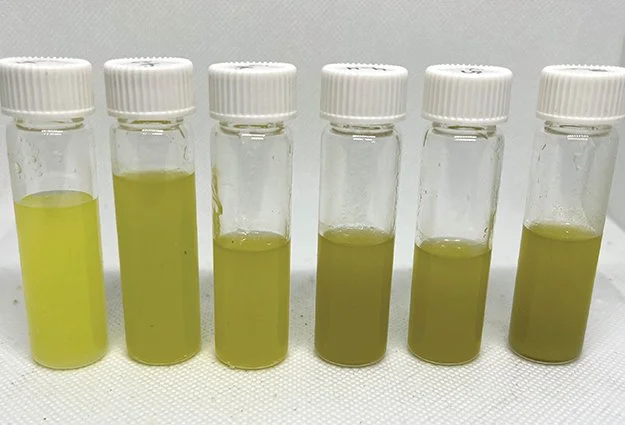 Samples of oil removed from milled hemp seeds over the course of a CO2 extraction run